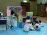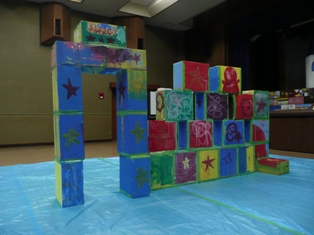 さやま☆きっずアーティストの今日は2日目です。昨日みんなで作ったダンボールのお城に色をぬっていきます。
