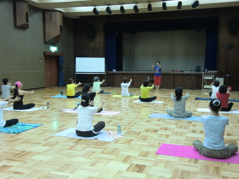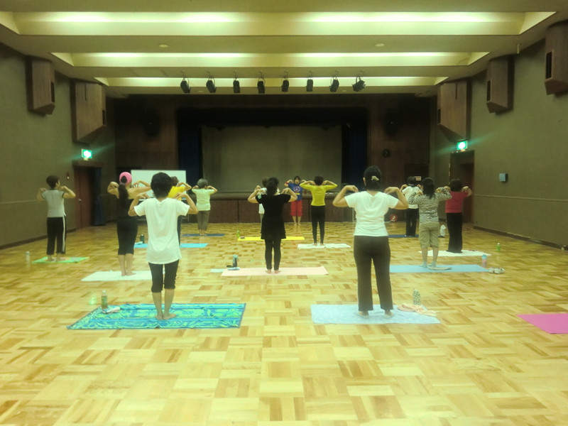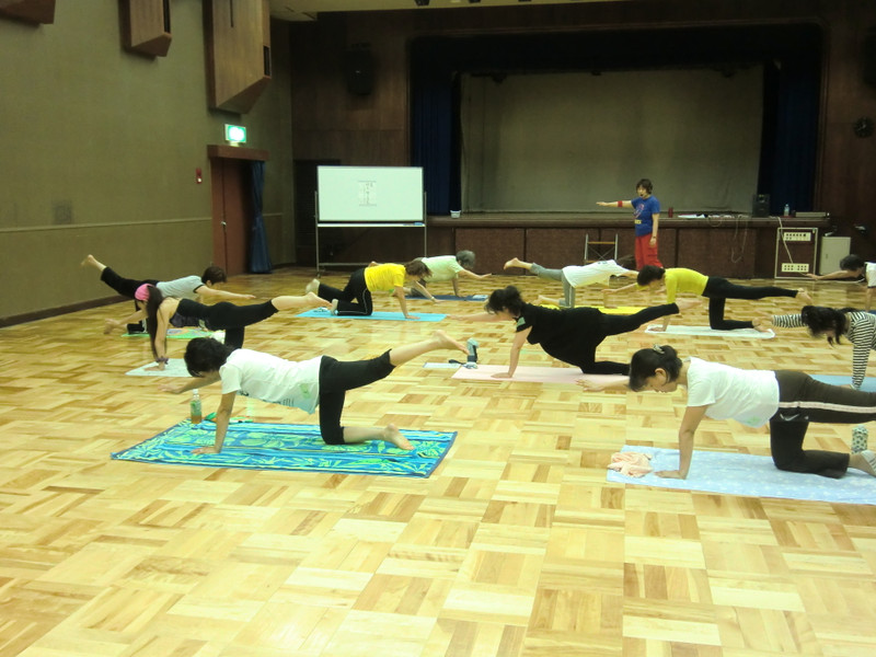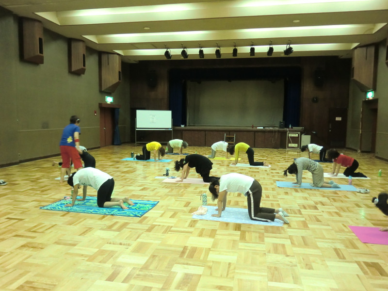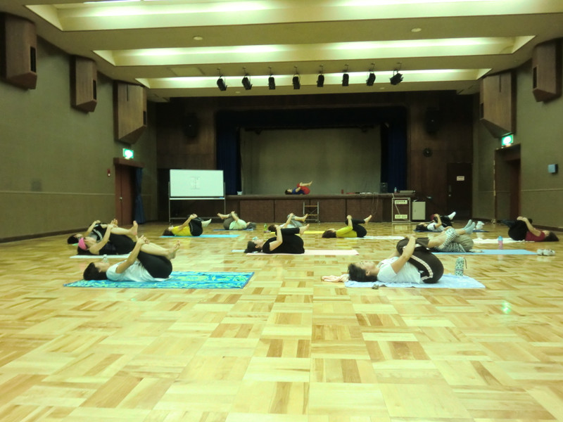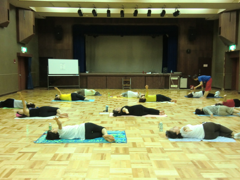 まずはウォーミングアップ。身体を動かす前に肩甲骨をしっかりほぐしましょう。「家でやってみた人~」と先生の質問に何人か挙手してくださいましたが、「家でやると呼吸法が混乱して・・」との事でした。「みんなでこの空間でやるのが楽しいし、わかりやすい」とおっしゃってくれる方もいました。音楽にあわせて動くのが楽しいですね。
