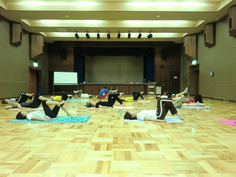 肩甲骨をほぐすことによって、肩こりがよくなったり、背中がきれいになるそうです。後ろ姿がきれいに見えると聞いて皆さん、真剣に動いていました。鼻から吸って口から息を出す呼吸法でもお腹がしまっていくそうです。呼吸法は動いていると忘れがちですが、しっかりしましょう。