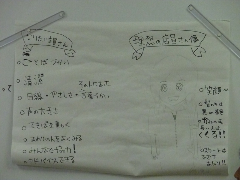 プロの接客マナーの見本を見せていただいて、ディスカッションをして「理想の店員さん像」「なりたい店員さん」をまとめていきます。