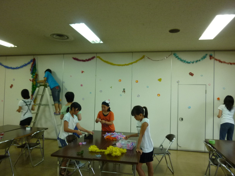 キラキラモールや花飾りで公民館のフロアーが可愛いカフェに変わっていきます。