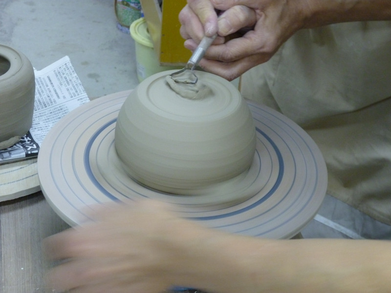 ある程度乾燥したら削りだしです。削りすぎると穴があいてしまうので様子を見ながらろくろを回して削ります。