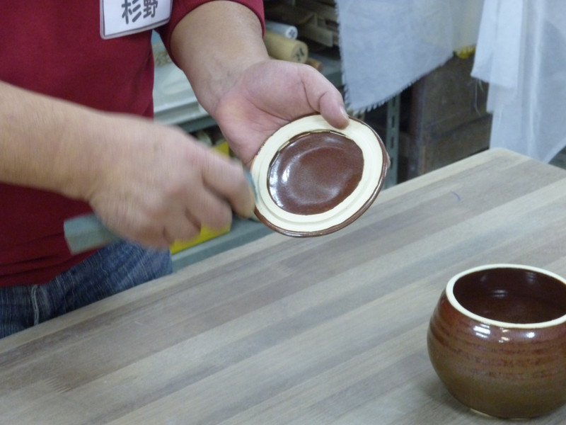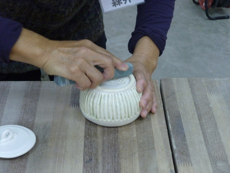 蓋の裏側や、ポットの底などに丁寧にやすりをかけていきます。