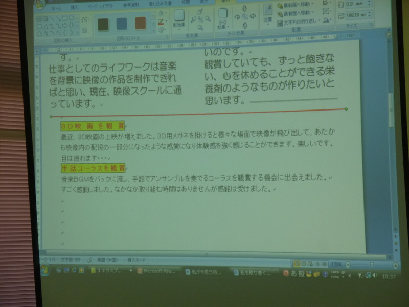 まずは、“ちょっとMY新聞”の仕上げに入ります。皆さんの最近の体験談を入力後、それぞれのタイトルを四角で囲み色を付けたり背景を塗りつぶししたりして目立つようにしました。