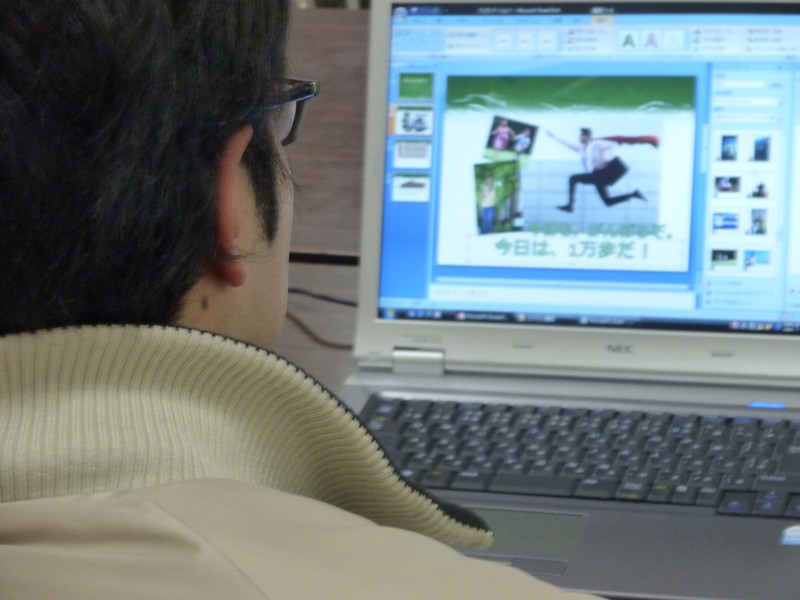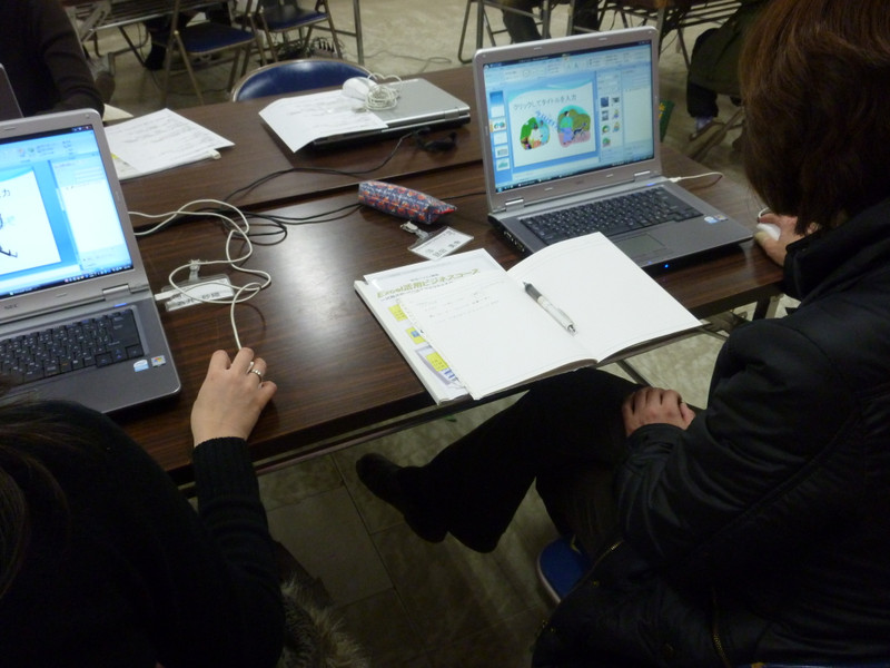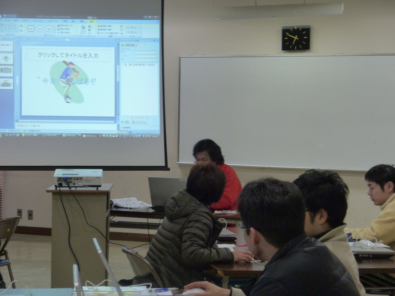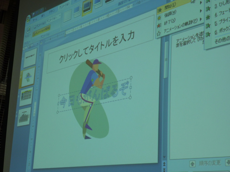 前半はエクセルではなくパワーポイントの基本をやりました。1枚1枚のスライドを作成し簡単なスライドショーができるようにします。