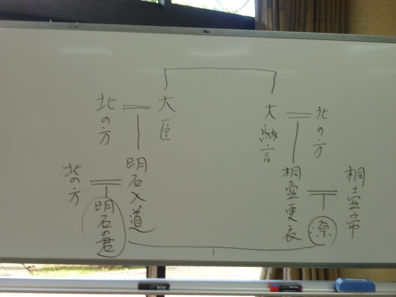 明石入道は源氏の母親である桐壺更衣と血縁関係にあると北の方に説明していました。源氏物語にはたくさんの人物が登場し、役職も様々です。岩井先生は「文章では関係性などわからないことも、メモをとってみると意外なことがわかることがある」とおっしゃっていました。確かに先生が書いた家系図をみると明石入道と桐壺更衣が、いとこ関係にあることがわかりました。文章からそこまで想像するのは難しいかもしれませんね。