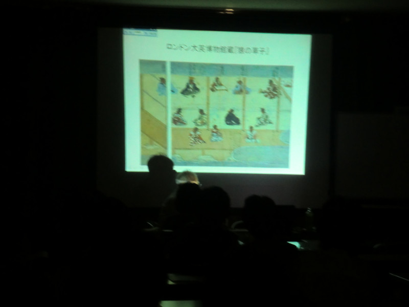 途中、前のスクリーンに連歌の様子を描いた絵巻を映し出して、どんな様子で連歌を詠んだか見ました。連歌を詠む人・記録する人など描かれており、天神様を祀っている様子がありました。天神様は和歌の神様とされていたそうですよ。
