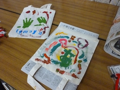 最初はエコバックに、その後は1m×10mの不織布に絵具とクレヨンを使ってらくがきをしました。