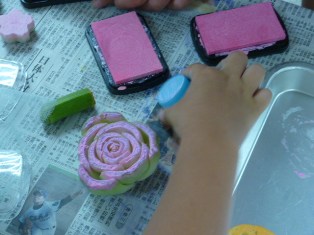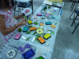 野菜だけでなく、プチプチのシートやペットボトルキャップもスタンプにして楽しんでいました。