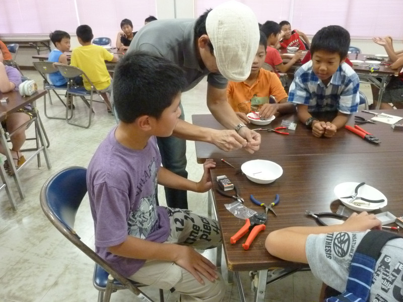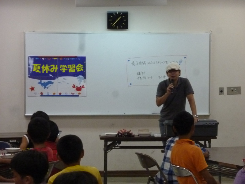 7月20日の天体観望会から始まった大阪狭山市立公民館の夏休み学習会2013も、いよいよこの「電子部品ロボットストラップをつくろう!」で最後です。