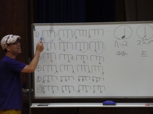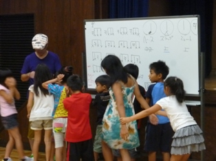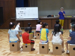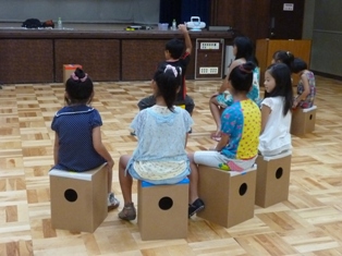 全員で同じリズムを叩いたり、チーム分けをして色々なリズムを叩いたりして、子ども達はゲーム感覚で楽しく、だけど真剣にカホンを叩いていました。