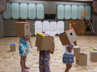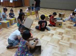 段ボールカホンで音楽と工作を楽しみ、休み時間には、それを使って鬼ごっこを楽しみ、子供たちの笑い声がいっぱい聞こえました。
