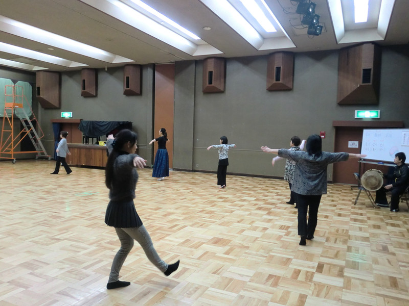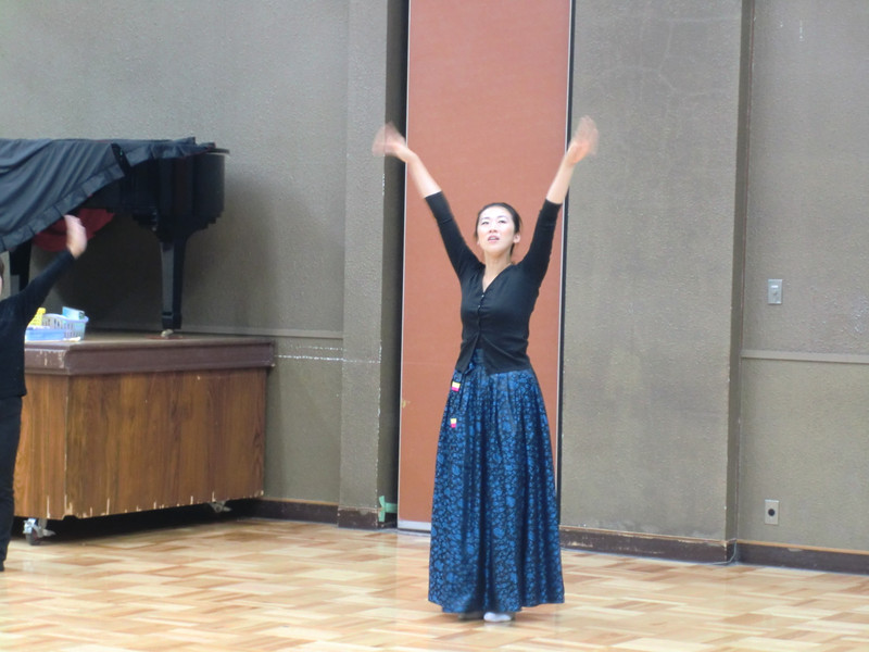 足の動き、手の動きを練習し、実際踊りに必要な3つの動作 回る・巻く・歩くをやってみました。みなさん、チャングの音に合わせてとてもきれいに踊っています。大事なことは呼吸をしっかり行うこと、呼吸をすることで流れのある動きになっていました♪