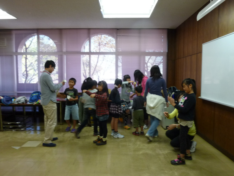 できてから、遊びの部屋に移動して飛ばしてみました。うまく飛ばすコツも武藤さんから学生さん達に伝授➜小学生に伝授されています。そして一緒に遊びました。思った以上によく飛びます。