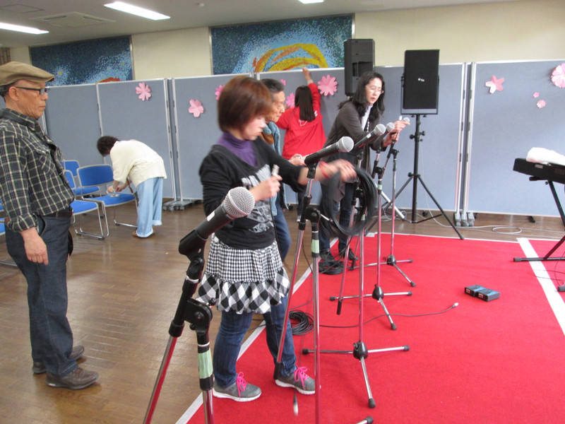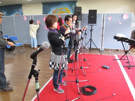 お天気が良ければ玄関前広場の桜の下で開催予定でしたが、あいにく天候が思わしくなく、前回と同じ、館内でステージをつくりました。