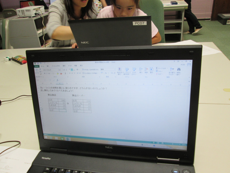 パソコンのエクセルを使います。カレーライスを作るのに必要な材料をあげて、2つのスーパーのうち、どちらで買い物をすると安くすむかという問題です。架空の狭山商店と狭山スーパー。それぞれの材料の金額を入力しオートSUM関数を使って合計を出し比較しました。