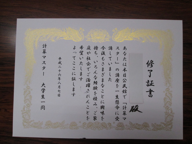 そして、先ほどの部屋に戻り、一人づつ修了証をいただきました。