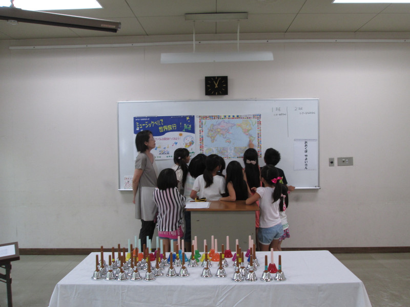 そしてミュージックベルの持ち方から音の出し方を教わります。初めは恐る恐るでしたが、子どもたちの飲み込みは早いものです。うまく音を合わせていい感じです。