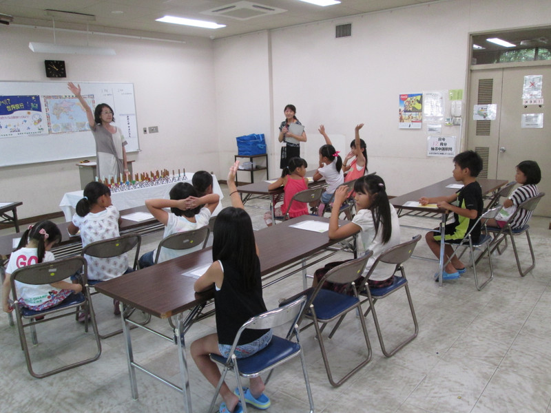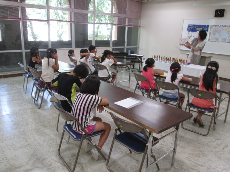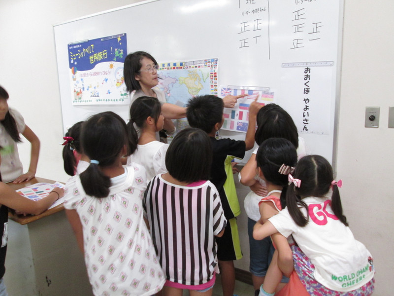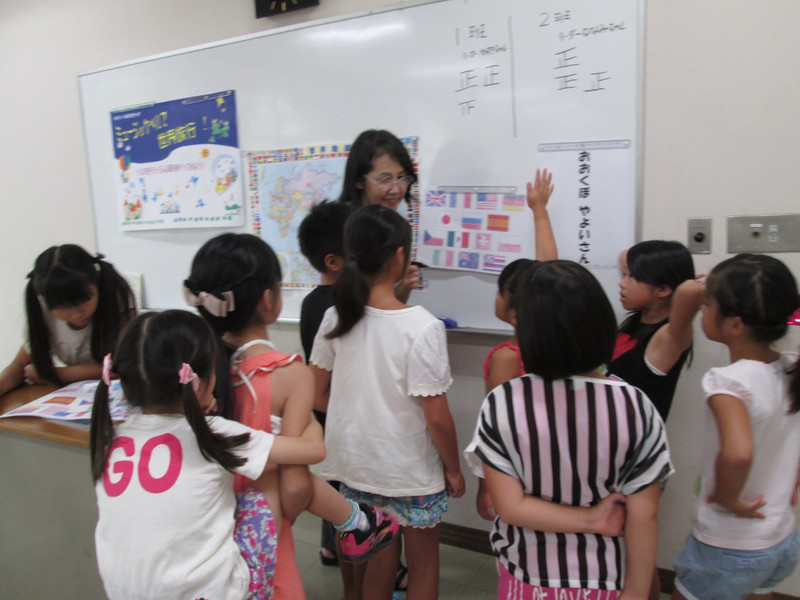 イギリスってどこにあるのかな?前に来て世界地図で確認です。話す言葉は?有名なものは?国旗はどれ?2班に分かれて班対抗で競います。だから解答権はわかった子どもたち全員でじゃんけんポイで決めました。その解答、いろいろ珍解答がでて思わず噴き出すことも・・・