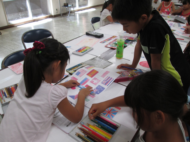 ここで国旗を描いてみました。今回世界旅行をする国の国旗です。見本もあります。