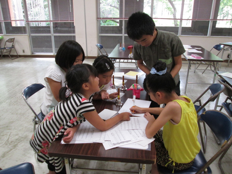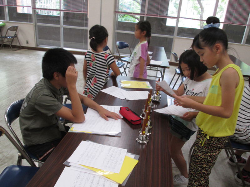 この曲にはどの音がいるのか、楽譜を見て自分たちでわかるようになりました。そして誰がどの音を受け持つのかも、リーダーが中心になって決めます。練習は真剣です。