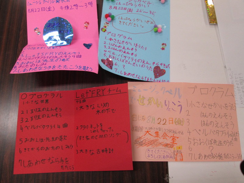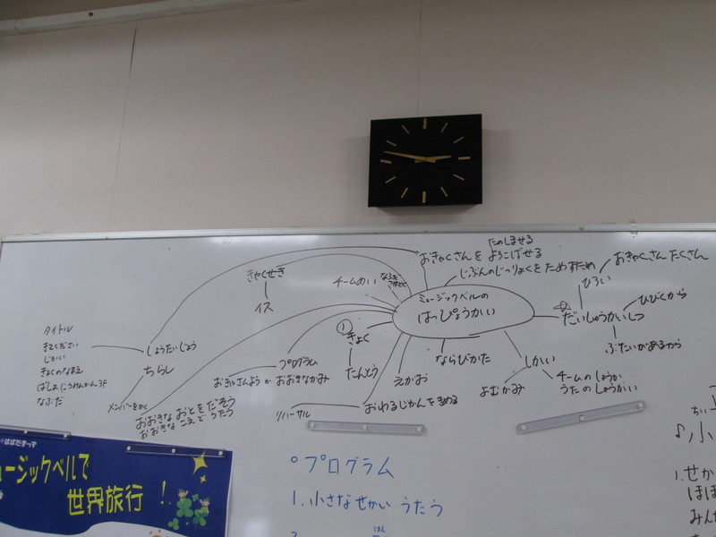 ミュージックベルの発表会を行うのに何が必要なのか考えてもらいました。次々にでてきます。準備に必要なもの。お客さん。お客さんを呼ぶには招待状やちらしが必要だと思いいついたようです。お客さんを喜ばせること。笑顔などもあります。