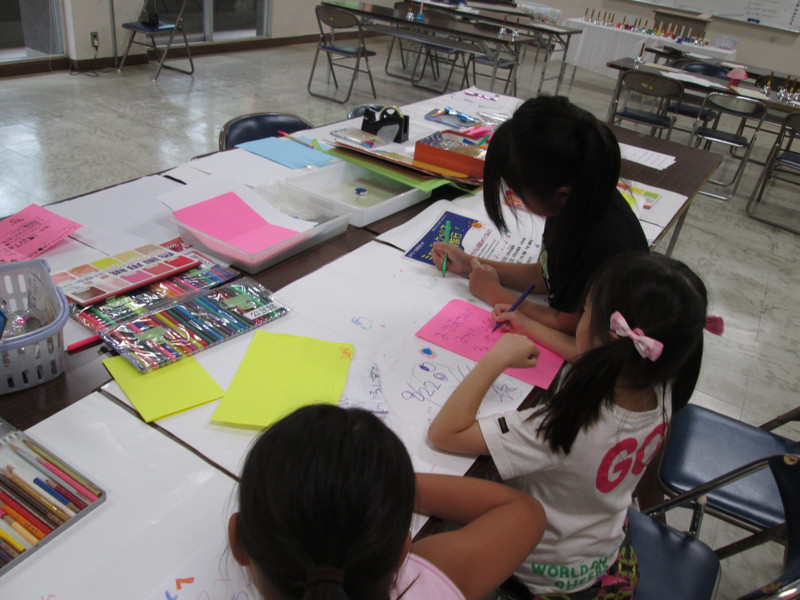そして招待状を作ります。おうちの人に宛てて気持ちを込めて書いています。何を書いてよいかわからない小さい子には自然に上の学年の子どもがついて教えているのを見て嬉しく思いました。