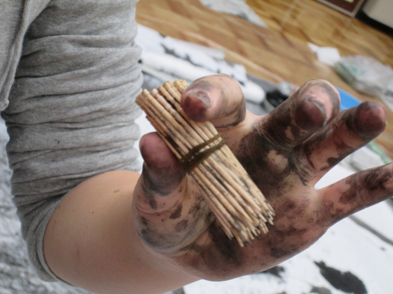 何かひらめいたようで、爪楊枝を全部まとめてゴムでしばってます・・・