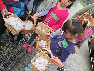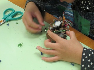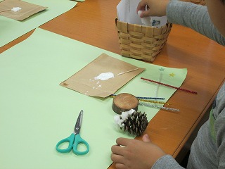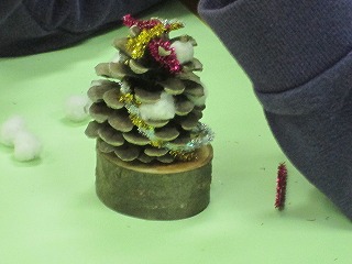 最後にまつぼっくりに、わたを飾ってクリスマスツリーを作ってたのしみました。