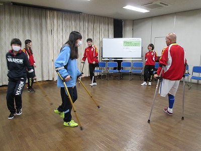 装着されていた義足をはずして、いろんな義足があることを教えて頂いたり、膝下で切断しているか膝上で切断しているかで、杖なしで、義足で走る事が出来るかどうかが違ってくるなどのお話もして頂いて、アンプティサッカーのことだけでなく、初めて見ること知ることもいっぱいでした。