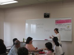 まずはペアになり、お互いの自己紹介を日本語でしました。今まで外国はどこへ行きましたか?どこへ行きたいですか?の質問には、皆さん海外経験豊富でびっくり。ツアーじゃなく、一人で行くという方もおられ、英語を喋られなくても、度胸で大丈夫!なんてお話も飛び出しました。爆笑ありの自己紹介でした。さあ、2時間でマスターしましょう、ということで海外で英語を喋るコツを教えていただきました。