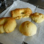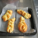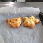 ひとりあたり3種類のパンを焼きました。一つ目は板チョコをつかったチョコレートパン、二つ目はウインナーをつかったウインナーパン、最後の一つはオリジナル。みつあみパンやまるパン、動物パンやお花のパンができあがり、同じパン生地でも、まるめ方やちょっとした工夫で何種類ものパンができるのがわかりました。