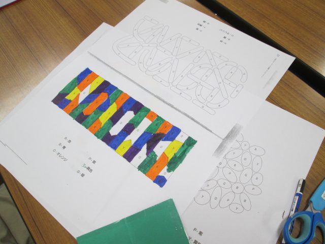 指定された色を塗っていくと、何がみえるかなぁ・・・赤と緑のシートから浮かび上がる文字や絵をみてみましょう♪