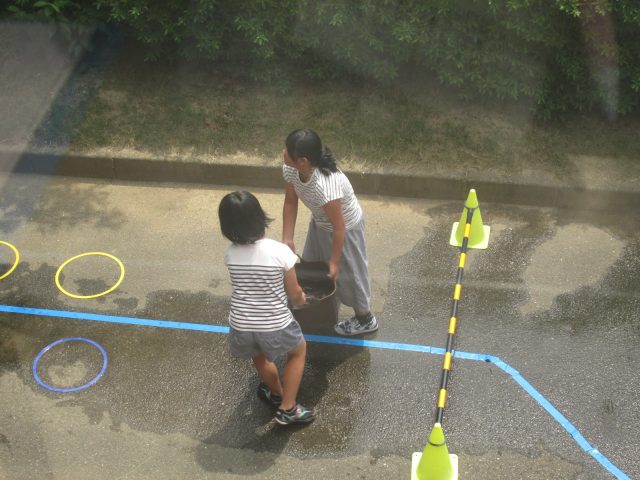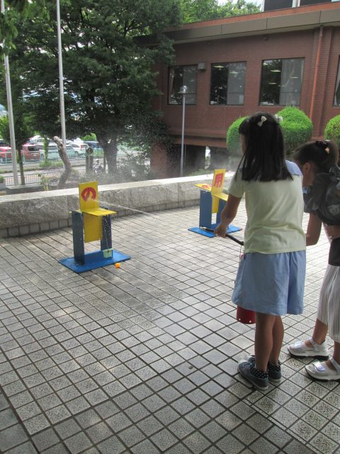 火の国では、水消火器を自分たちで書いてあることを読み解き、使って的にあてることを。