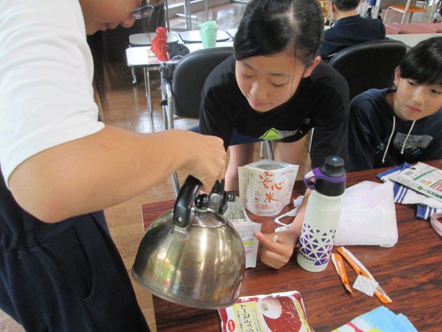 アルファ化米の使い方(食べ方)の説明を熱心に聞き、お湯を自分たちでドキドキしながら注いでいました。