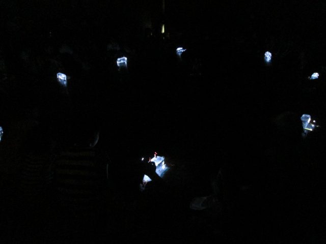 最後は、宝物として手に入れたLEDライトをペットボトルに当てて、明かりを大きくする方法を体験。暗闇の中でのあかりのありがたさも感じてもらえたでしょうか。