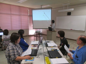 午後からはエクセルの講習です。前半はワードと同じようにウインドウとリボンの説明です。後半になって、スプレッドシートの考え方の講習です。まず、四則演算の入力です。ワード等と同じに様に考えていると、演算で使う数字をセルを参照する式で入力し、コピー・貼り付けした時に値が変ると、狐につままれた様うな感じになるのですが、それは、エクセルを使っている内に慣れていきましょう。ここで頭の切り替えができれば、スプレッドシートが楽しくなります。