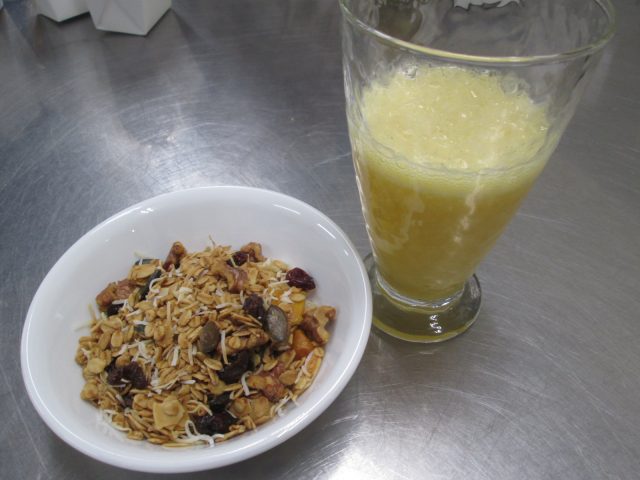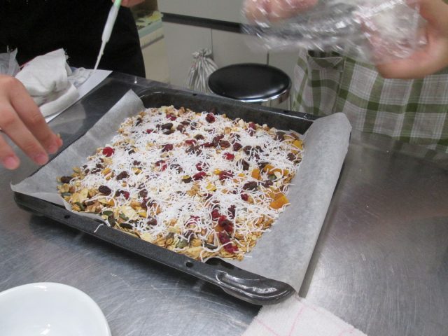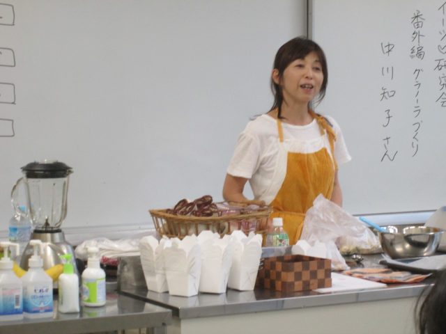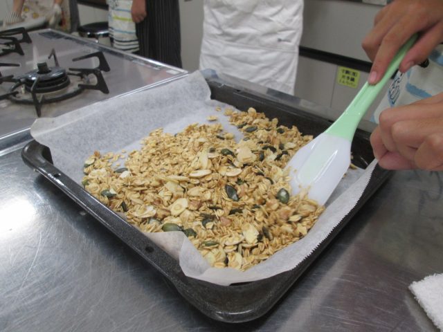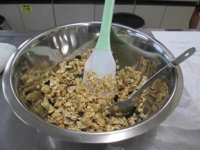 8月30日(水)は、『スイーツ♡研究会』の番外編①として、貝塚市から中川知子さんに来ていただき、”グラノーラづくり”を行いました。