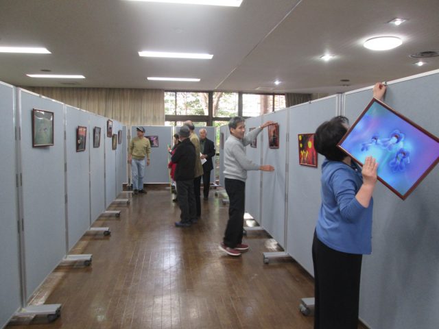 置いてあった机や椅子を片付け、パネルを準備します。そして41枚ある展示作品を見栄えがするよう つるしていきます。