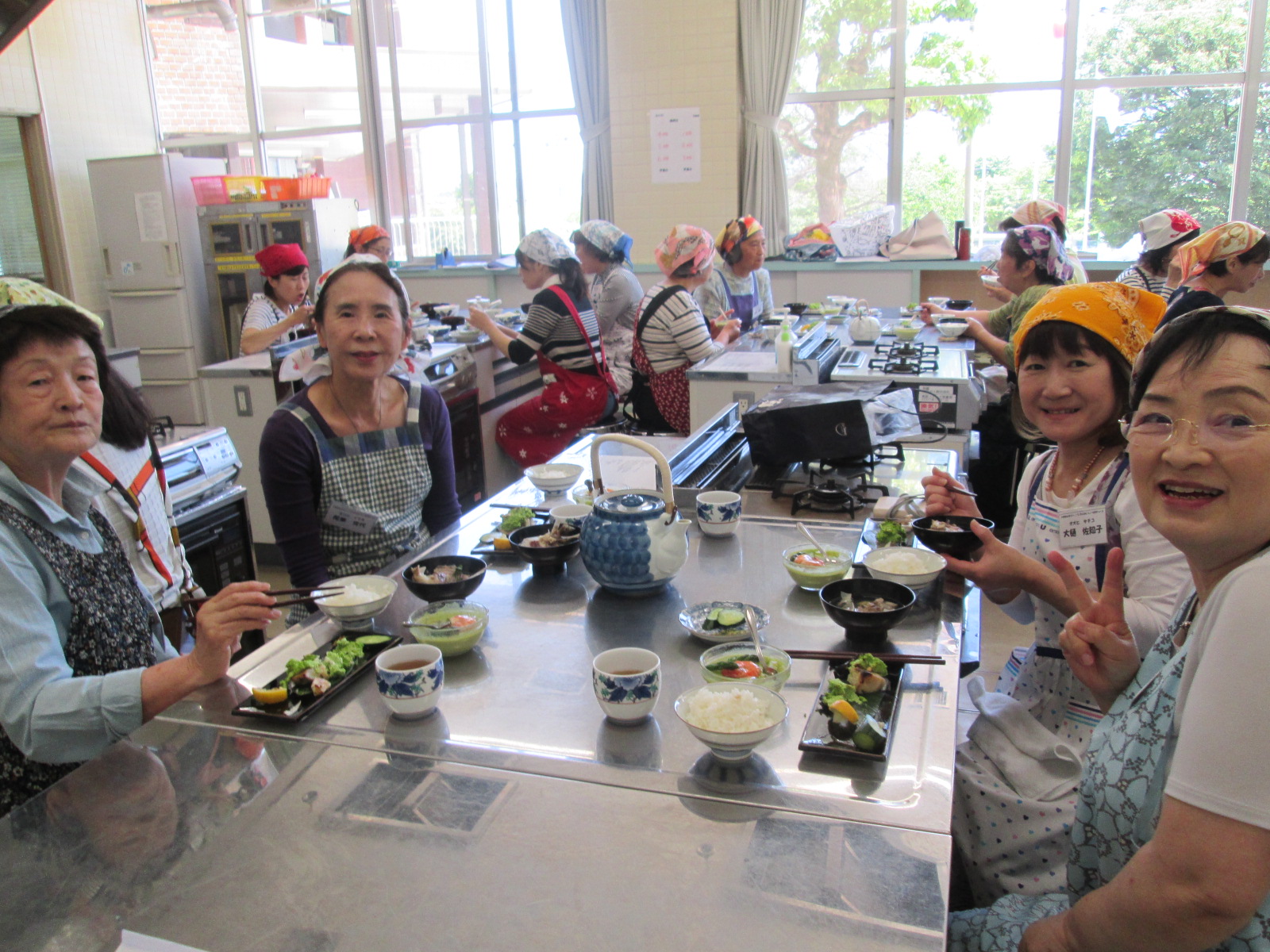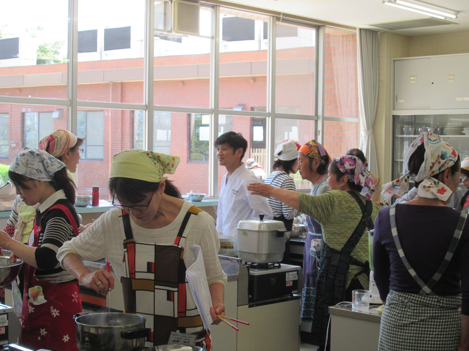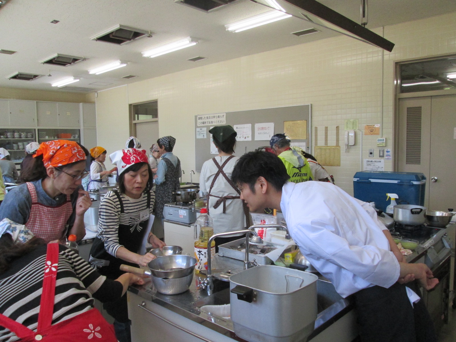 今回も公開抽選の結果40代~80代の男女24人の皆さんにお集まりいただきました。今日出会ったばかりの4人グループで学生時代を思い出して和気あいあいと調理しながら美味しい料理を学びました♪