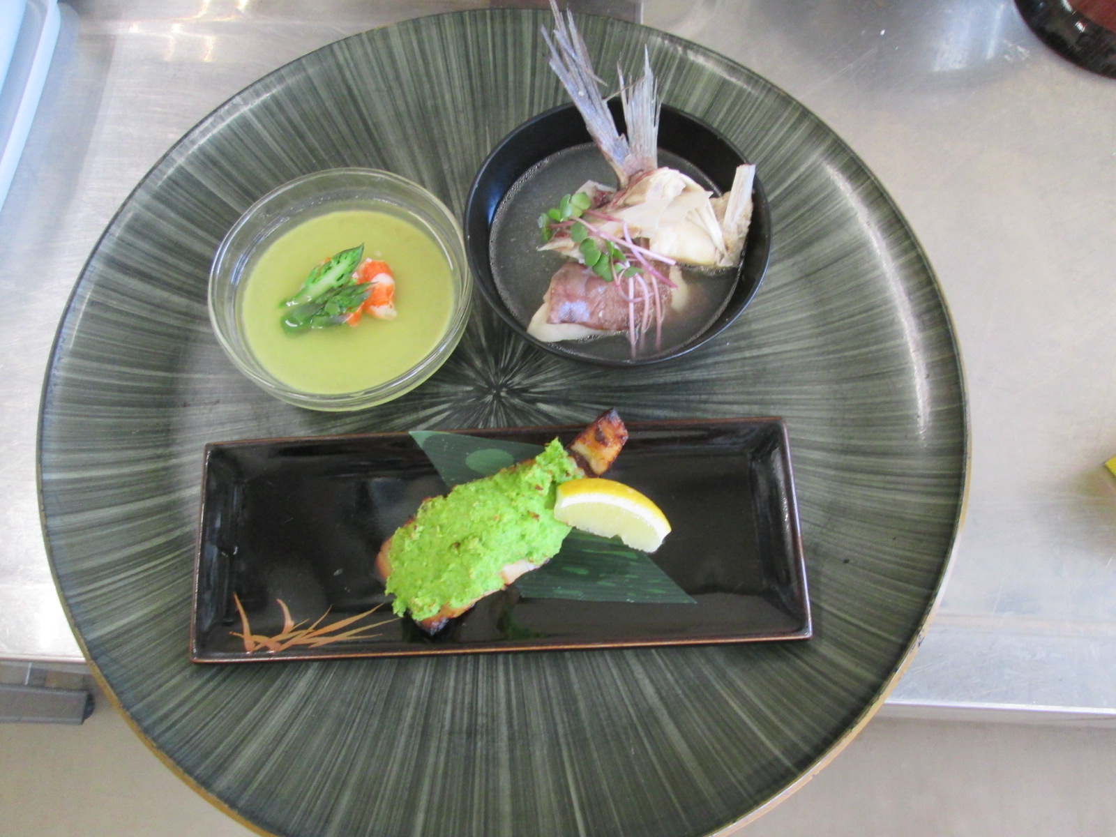 今日の献立は鯛の潮汁・鰆のうぐいす焼き・アスパラ豆腐です。