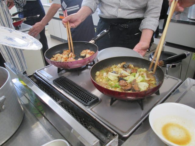 これぞ料理講座!の雰囲気の中それぞれのグループテーブルに4品が並べられました。