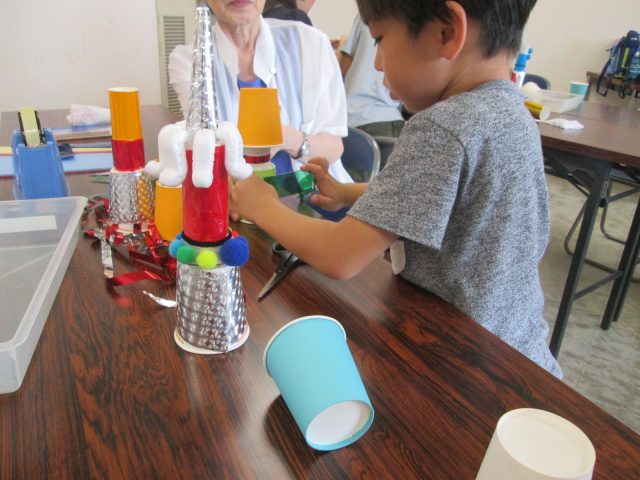 保護者の方も子どもがはさみの扱いなど危ない所は気を配ってくれながらも自分のロケットを作ってくれました。そして完成です。