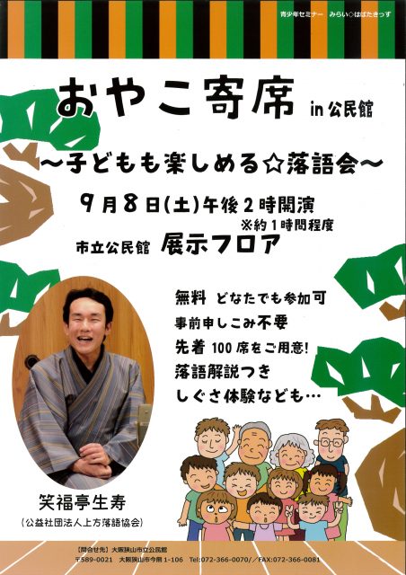 9月8日(土)午後2時から、1時間程度の予定ですが、笑福亭生寿さんをお招きして、公民館の多目的室と展示フロアの仕切りをとって、広い空間にし、子どもから大人まで、みんなで楽しめる落語会を実施する予定です