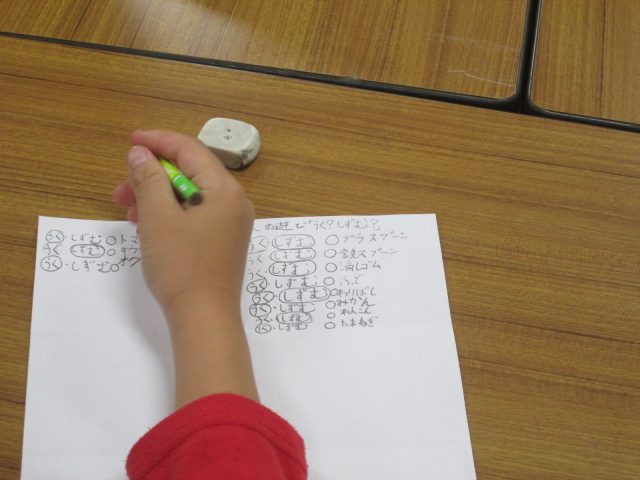 水のあそび「うく?しずむ?」にも挑戦しました♪けんちゃん先生が持ってきた重たいもの・軽いもの・大きいもの・小さいもの・穴の開いた野菜や果物など一つづつ予想しながら確認しました!浮いたり沈んだり本当に不思議ですね・・・・・!!