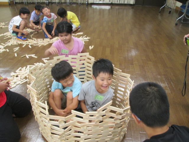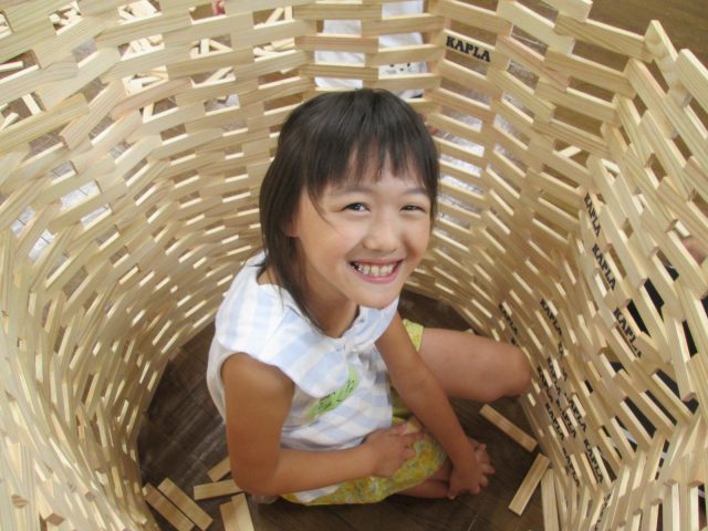 いよいよワンサイズの魔法の積み木(カプラ)で遊びます!けんちゃん先生に基本の積み方を教えてもらったらスタート♪みるみるうちにタワーやちょうちんができあがりました。