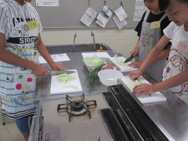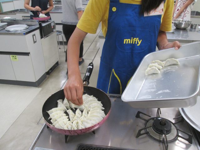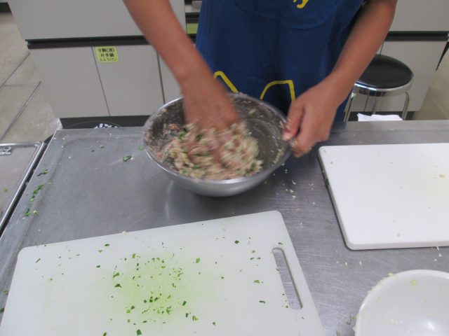 グループで餃子の具をつくり、皮で包んで、焼く作業をしました