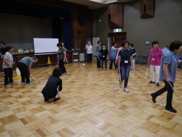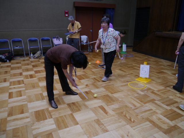 次は、新聞棒を持ってバランスに挑戦。そして、新聞棒と新聞ボールを使って、グラウンドゴルフ風ゲームをグループに分かれてチャレンジしました。