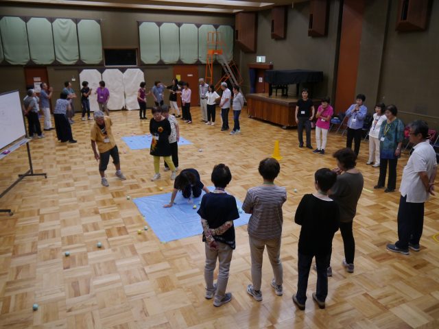 最後は、4つのグループに分かれて、2グループずつで、新聞ボールを使って、ペタンク風ルールでゲームをしました。