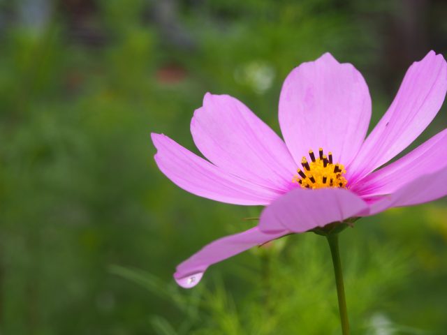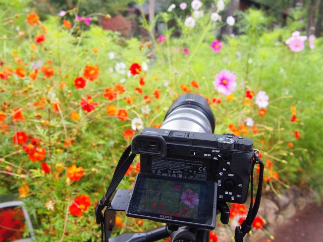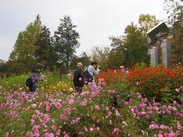 いざ、温室へと向かう途中、小雨になったので、コスモスが咲いている屋外で撮影会が始まりました。